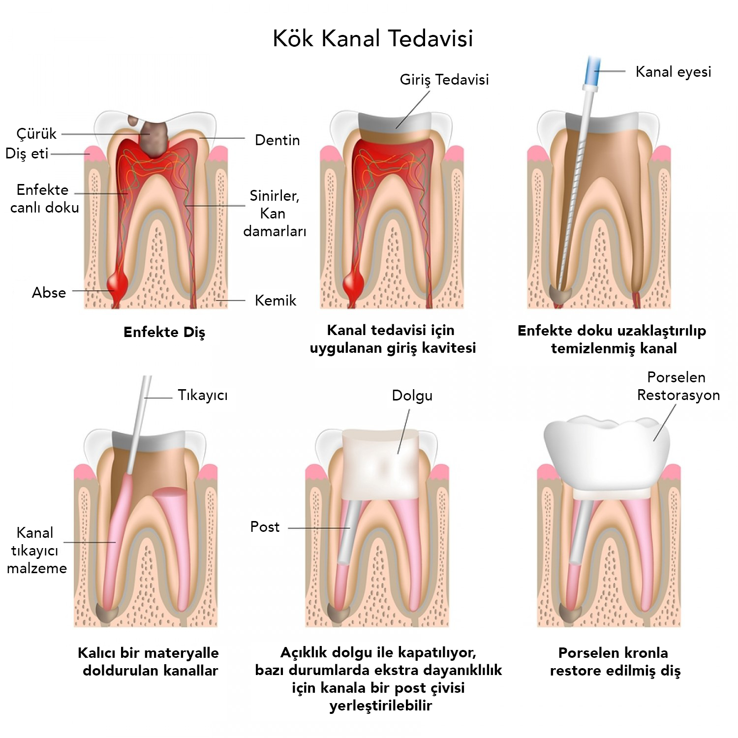 Dişin içindeki canlı doku (pulpa) çürük, travma, aşırı hassasiyet (diş eti hastalıkları, aşırı sert diş fırçalama) zarar gördüğünde uygulanan, bu canlı dokunun bulunduğu bölgenin temizlenip dezenfekte edilmesi şeklinde bir tedavidir. Temizlenen bölge, sızdırma oluşturmayacak şekilde bir takım dolgu materyalleriyle doldurularak üstüne restorasyon (dolgu, post-core + dolgu, post-core + porselen) yapılır. Kanal tedavili dişler canlılığını kaybettiği için kırılgandırlar. Diş dokusu kaybının miktarına göre restorasyonun ne olacağına karar verilir.